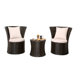 Bộ bàn ghế nhựa mây gồm 3 chi tiết: 2 ghế và 1 bàn. Được thiết kế tối giản, nhỏ gọn với không gian hẹp nhỏ, không quá nhiều hoa văn sặc sỡ hay cầu kì nhưng bộ bàn ghế vẫn toát lên vẻ sang trọng vốn có. Những đường nhựa mây đan dày bao bọc toàn bộ chiếc ghế từ lưng ghế đến chân ghế. Chân ghế không thiết kế 4 chân vuông như bình thường mà là chân ghế tròn tránh lật đổ. Phần lưng ghế cũng được đan hình vòng cung ôm trọn tấm lưng người sử dụng. Đệm ghế màu trắng nổi bật vừa khít với phần chỗ ngồi. Ngoài ra ghế còn kèm thêm một chiếc gối tựa lưng, giúp người dùng thoải mái hơn khi sử dụng. Phần bàn được vuốt cong nhẹ vào giữa như một thiếu nữ mềm mại đoan trang vậy. Toàn bộ bàn ghế đều bọc kín bằng nhựa mây, không lộ ra bất kì khung nhôm nào, thật tinh tế phải không nào?